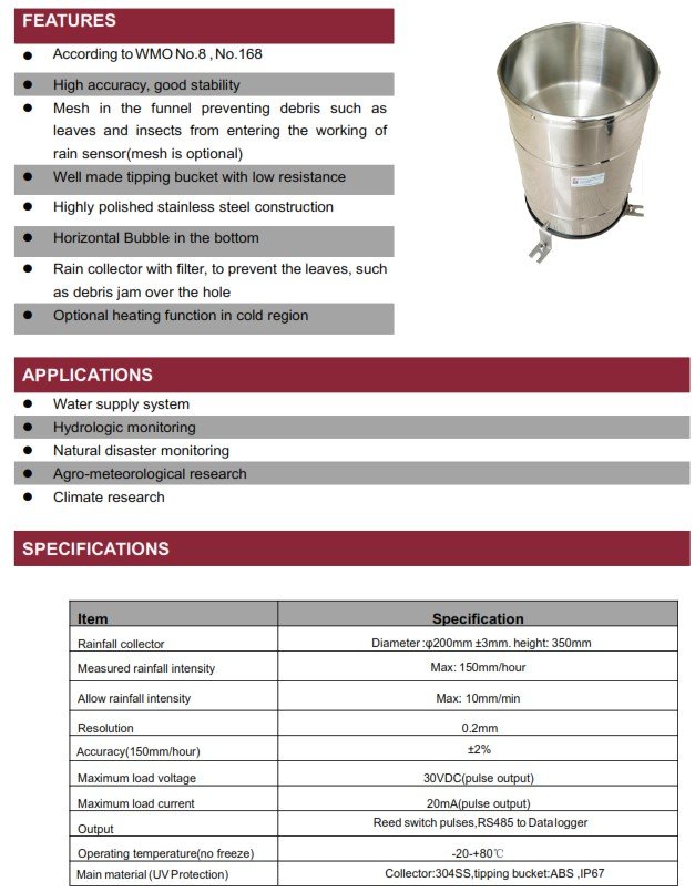 Collector:304SS,tipping bucket:ABS,IP67 |