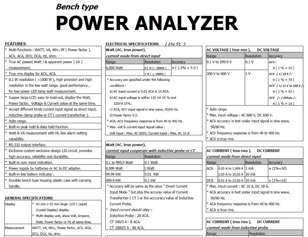 • Multi-functions: Watt, VA, W hr, Power factor, ACV, ACA, DCV, DCA, Hz, ohm